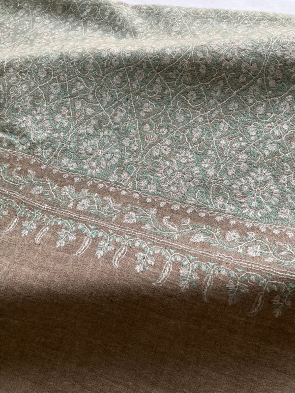 それはとても薄くて軽く、なんとも言えぬ柔らかな肌触りで、美しい色の、とても細かい刺繍がされていました。私は、初めて触れたパシュミナの柔らかさと、美しい手仕事の魅力に、すっかり心を奪われました。