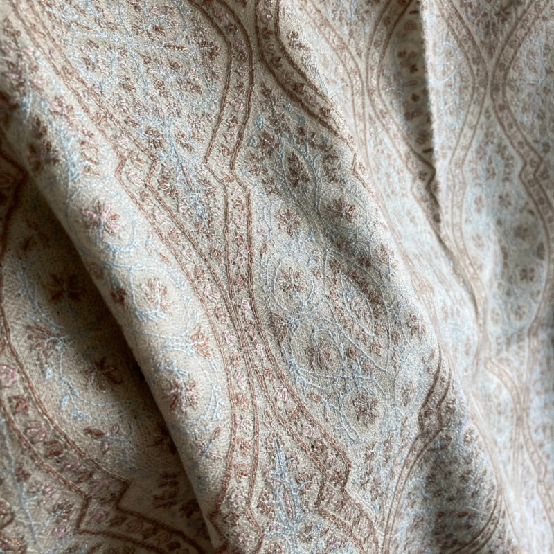 インド・カシミールの伝統工芸品「パシュミナ」と、そこに施された手仕事の刺繍。ため息が出るほどの美しい手仕事です。