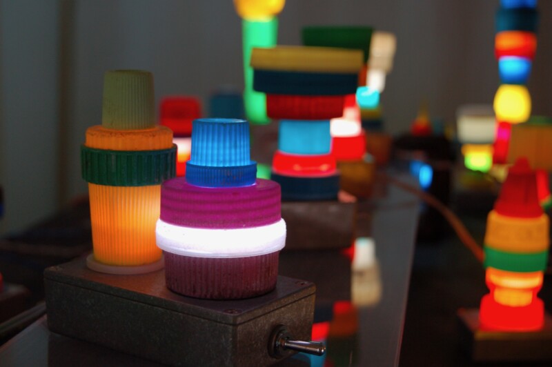 写真の作品は、LEDライトの上にキャップを乗せたもの。キャップを選んで乗せると、さまざまなな色の灯りを楽しむ事ができます。不要なキャップが、遊べるモノに変わった途端、急に「価値」が出てくる事が不思議ですね。さらに、経年劣化したものの方が綺麗な色を出すこともあり、これもまた不思議な体験でした。