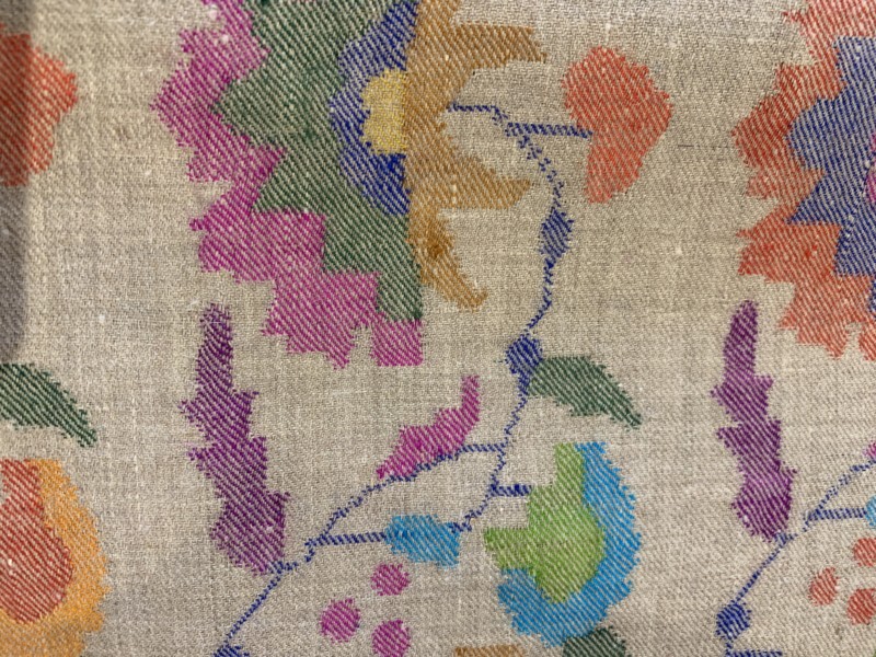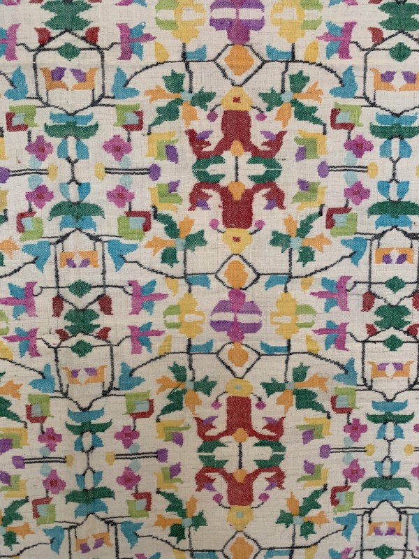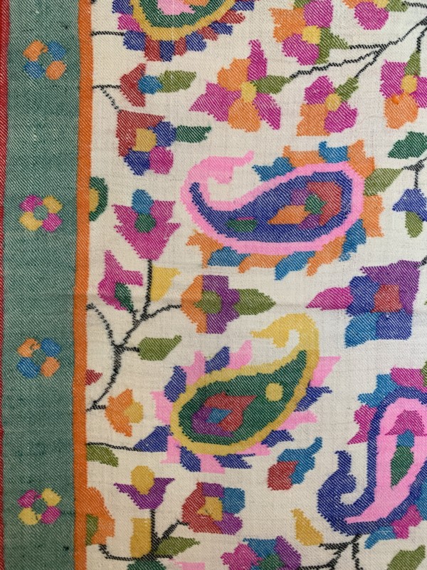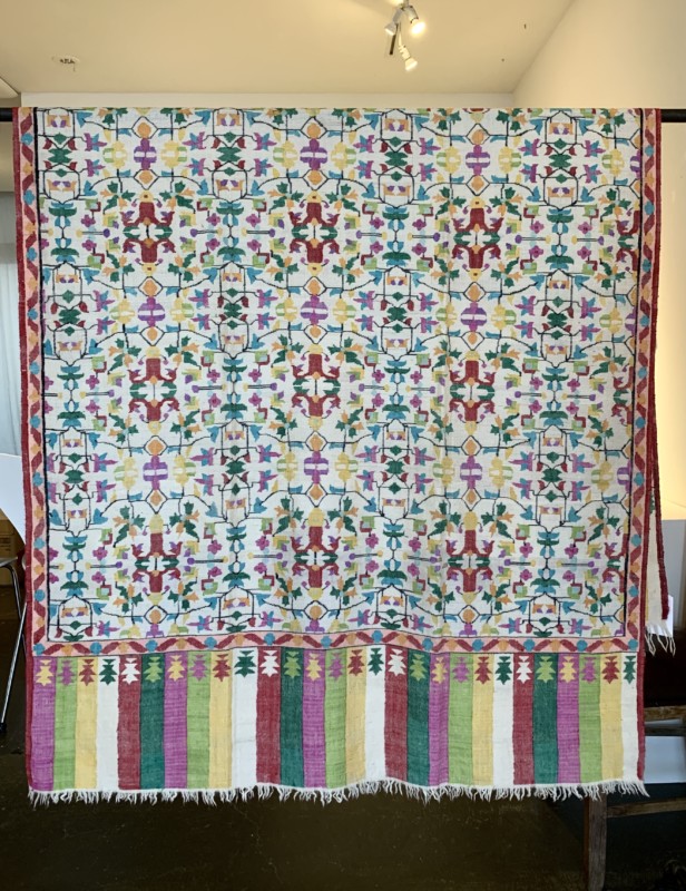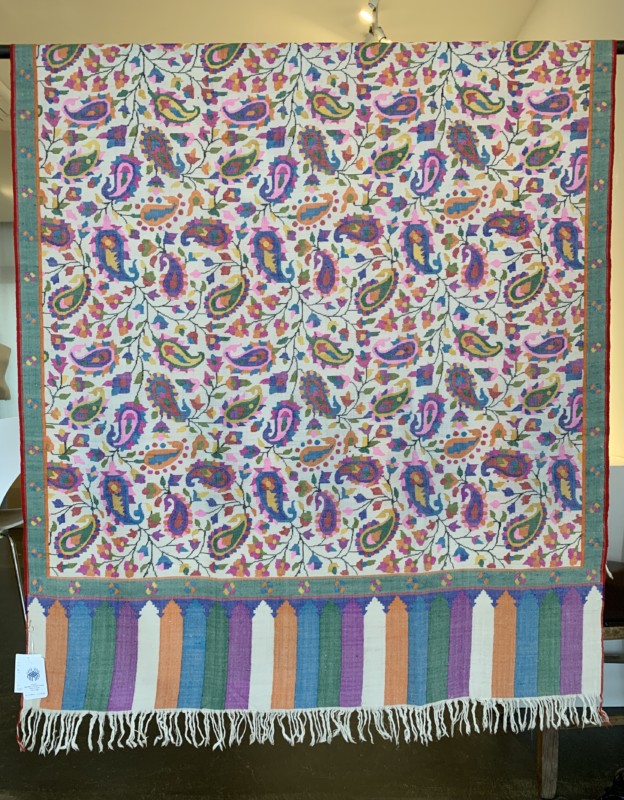 今回、10点だけ出品されている「カニ織」は、カシミールで最も歴史の古い布だと言われています。その昔、カシミールを統治していた王様が、トルクメニスタンの絨毯職人を国に迎え、絨毯と同じ技法でカシミアの布を織らせたのがその起源です。