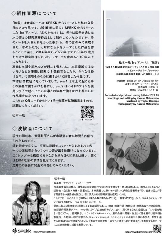 松本さんが即興で生み出す音は、聴くものの奥底に響き渡り、内なる世界へ静かに降りていく感覚があります。音の中に入り込むような不思議な感覚だったのを記憶しています。美しい波紋音の響きと共に是非体感して頂きたく、ご案内いたします。
