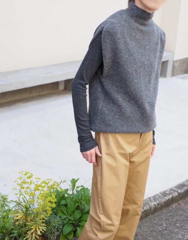 さらに季節が進めば、インナーとして「コットンシルクシフォン」、そして極薄の「ウールシフォン」や「ストレッチブークレ」のベストなど、重ね着で暖かく。