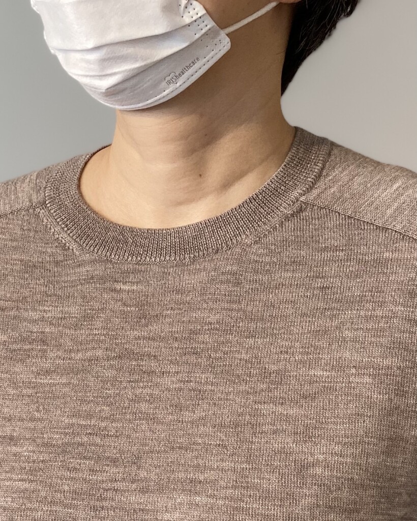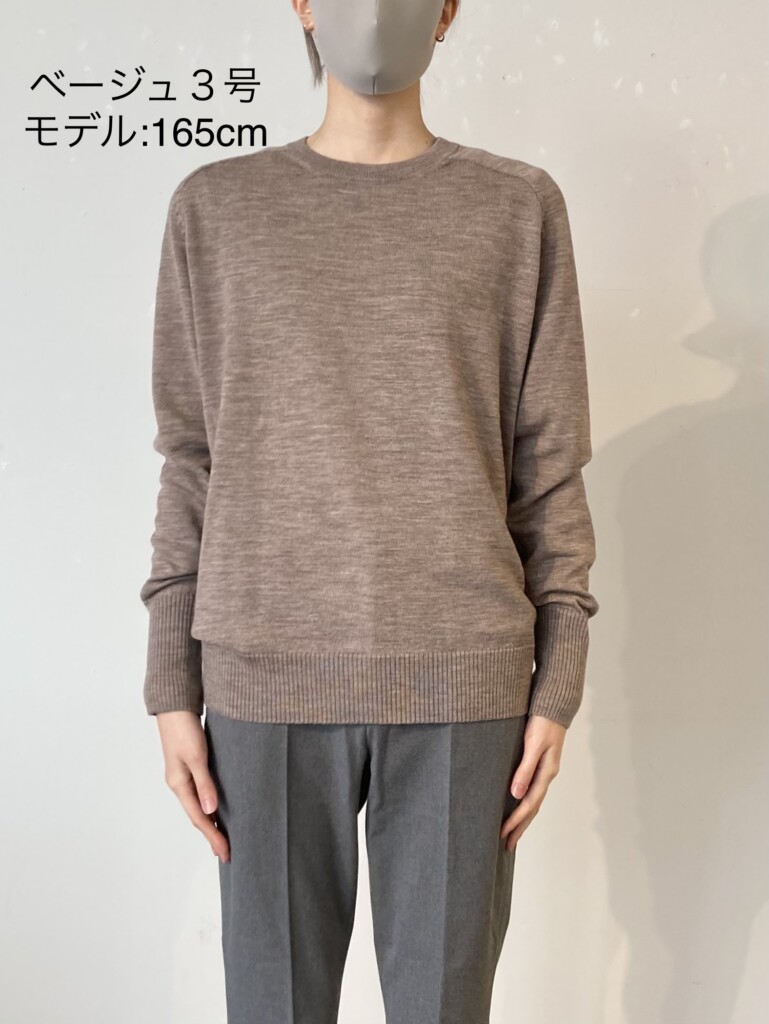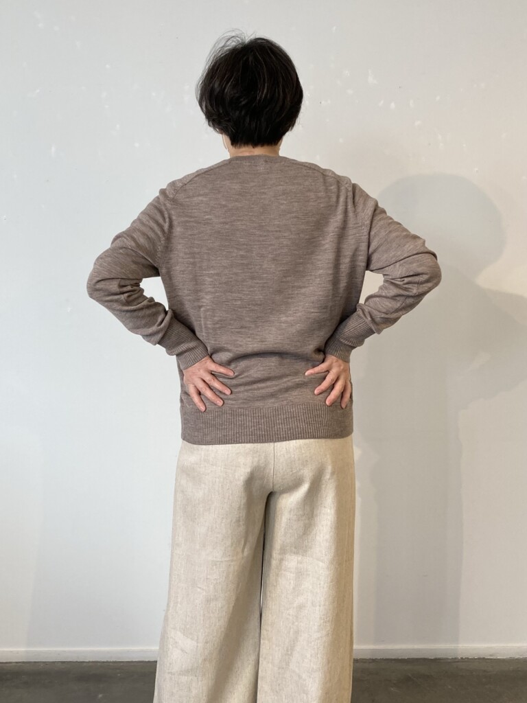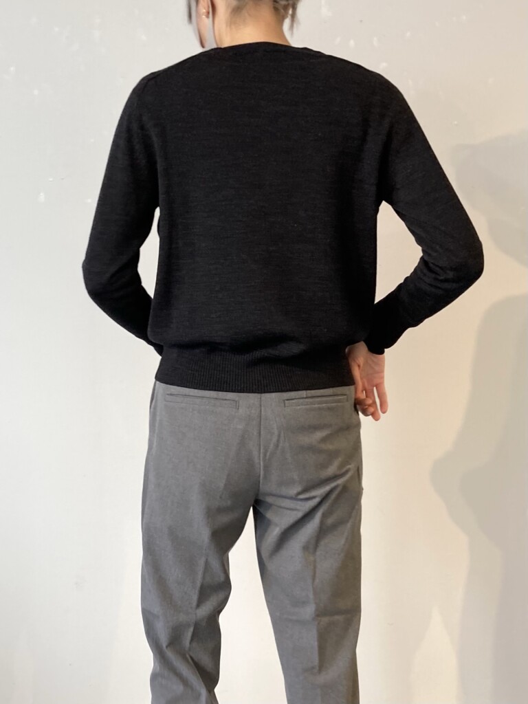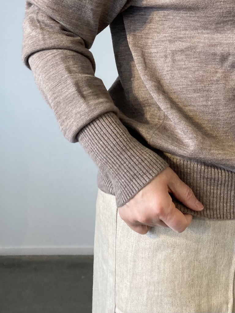 「スーパー エクストラ ファイン メリノウール」という、イタリアの上質糸を使用されています。細い糸を密に編み上げた、滑らかな手触りのセーターです。
